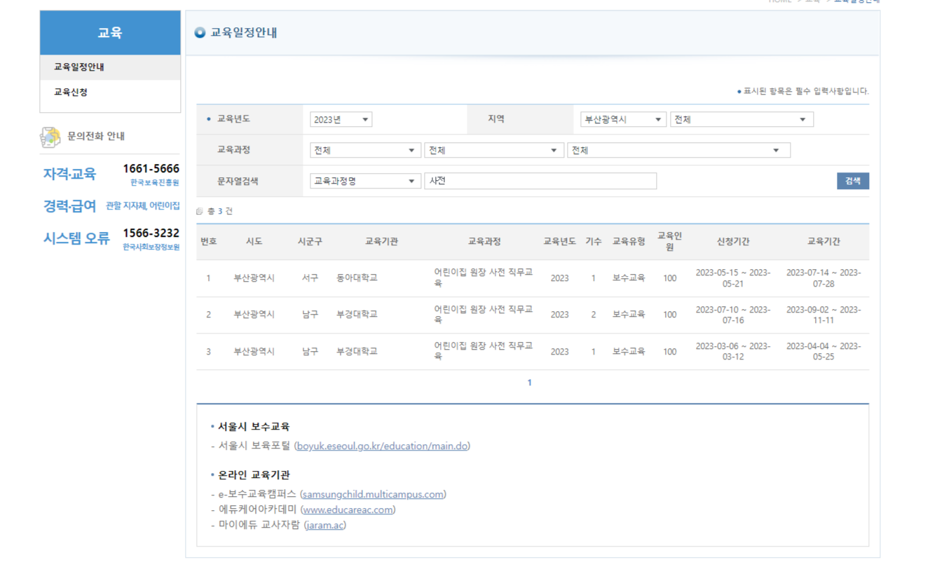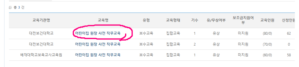 4. 해당 지역에서 실시하는 원장사전직무교육을 확인하실 수 있습니다. 교육기관 명과 신청기간, 교육기간을 확인하세요.