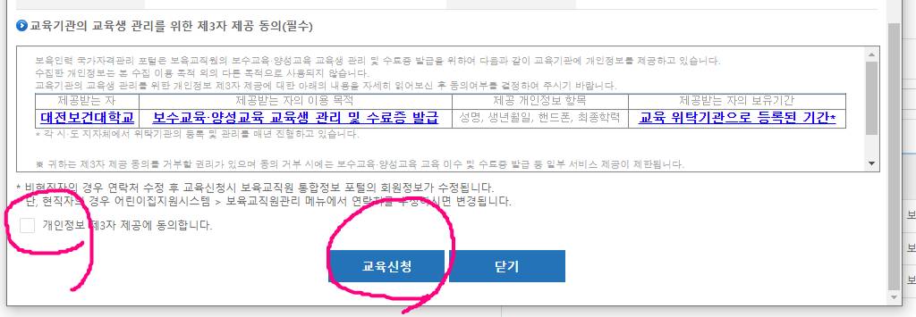 5. 개인정보 동의 체크박스를 클릭하고, 교육신청을 클릭합니다.