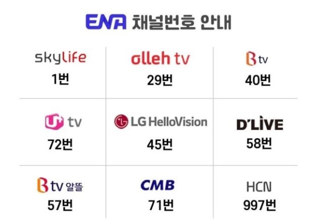 ENA 채널은 생소하신 분들이 많을 것이라고 생각됩니다. 저 역시 그랬는데요. 그래서 채널 번호를 안내해드리려 합니다.